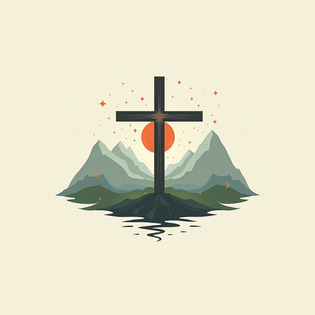 A stylized illustration of a cross on a hill surrounded by mountains and a winding river, set against a light background.